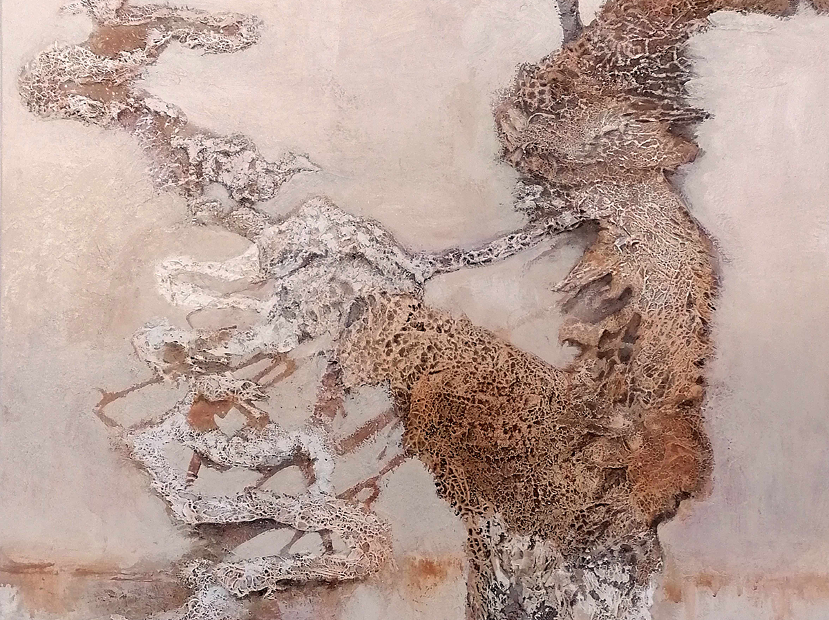 Getextureerde organische vormen zoeken hun weg in een verstilde achtergrond, sereen en krachtig tegelijk. Dit werk nodigt uit om het leven te blijven ervaren als mysterieus, gelaagd en wonderlijk.